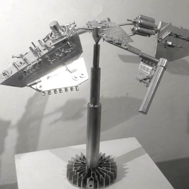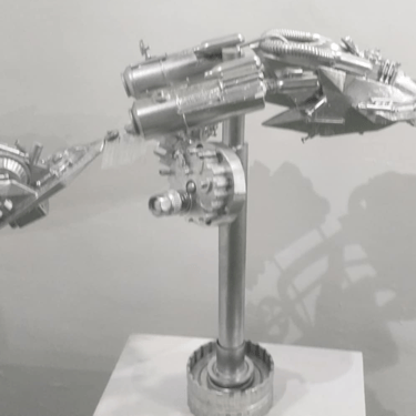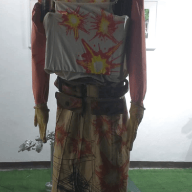 Wearable art installation. Canvas, wire, paint, and found objects.