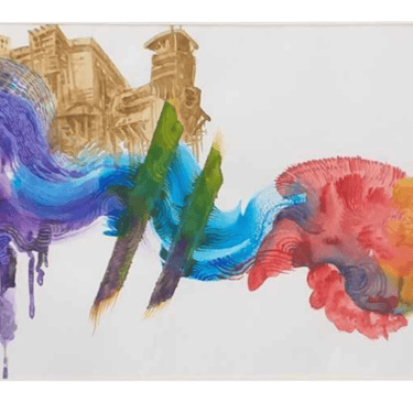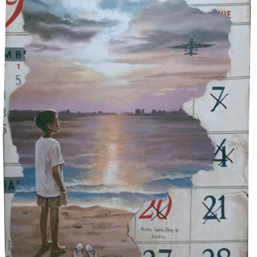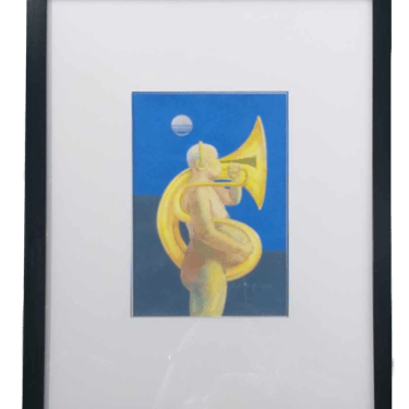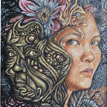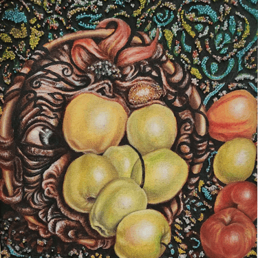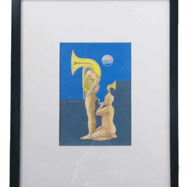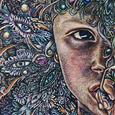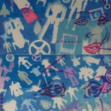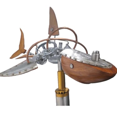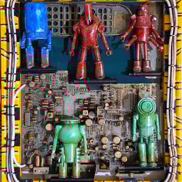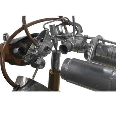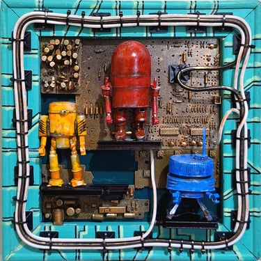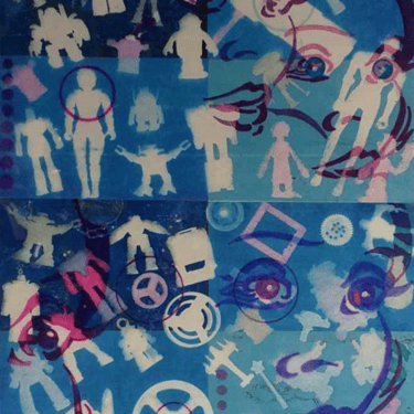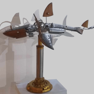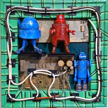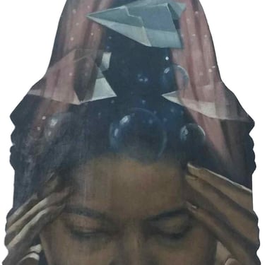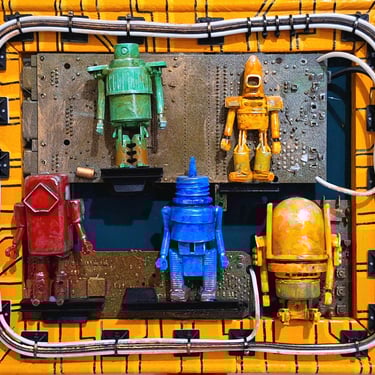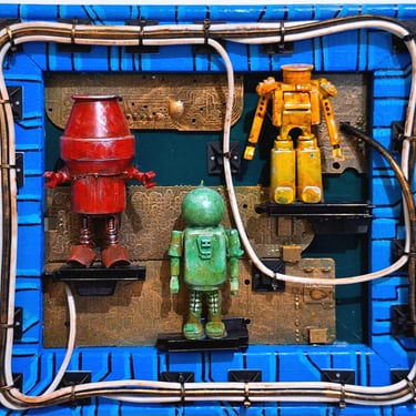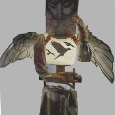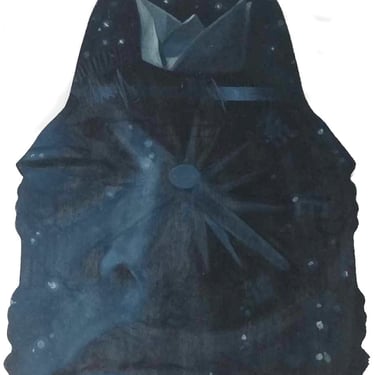 Wearable art installation. Canvas, wire, paint, and found objects.